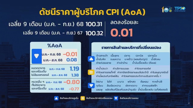 นายนันทพงษ์ จิระเลิศพงษ์ ผู้อำนวยการสำนักงานนโยบายและยุทธศาสตร์การค้า(สนค.) กระทรวงพาณิชย์ เปิดเผยว่า ดัชนีราคาผู้บริโภคทั่วไปของไทย(เงินเฟ้อ)เดือนก.ย. 2568เท่ากับ 100.11 เทียบกับก.ย.ปีก่อน ลดลง 0.72 % และลดลง 0.03 % จากเดือนก่อนหน้า เนื่องจากราคาสินค้ากลุ่มพลังงานลดลง ทั้งค่ากระแสไฟฟ้าและน้ำมันเชื้อเพลิงตามนโยบายของภาครัฐ และราคาในตลาดโล รวมทั้งราคากลุ่มอาหารสดยังคงลดลง โดยเฉพาะไข่ไก่ ผักสด และผลไม้สดจากผลผลิตที่เพิ่มขึ้น ส่วนดัชนีราคาผู้บริโภคทั่วไป เฉลี่ย 9 เดือนแรกปี 2568 ลดลง 0.01 % ขณะที่เงินเฟ้อพื้นฐานเดือนก.ย. ที่หักกลุ่มอาหารสดและพลังงานออก สูงขึ้น 0.65 % จากเดือนเดียวกันปีก่อน ส่งผลให้ 9 เดือนแรกเงินเฟ้อพื้นฐานสูงขึ้น 0.90 %