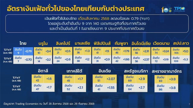 ทั้งนี้ หากเทียบอัตราเงินเฟ้อทั่วไปของไทยเมื่อเทียบกับต่างประเทศ ณ เดือนสิงหาคม 2568 พบว่า อัตราเงินเฟ้อทั่วไปของไทยลดลง 0.79 % โดยอยู่ระดับต่ำอันดับ 9 จาก 140 เขตเศรษฐกิจที่ประกาศตัวเลข และต่ำสุดในกลุ่มประเทศอาเซียน 9 ประเทศที่ประกาศตัวเลข (บรูไน สิงคโปร์ มาเลเซีย ฟิลิปปินส์ กัมพูชา อินโดนีเซีย เวียดนาม สปป.ลาว)