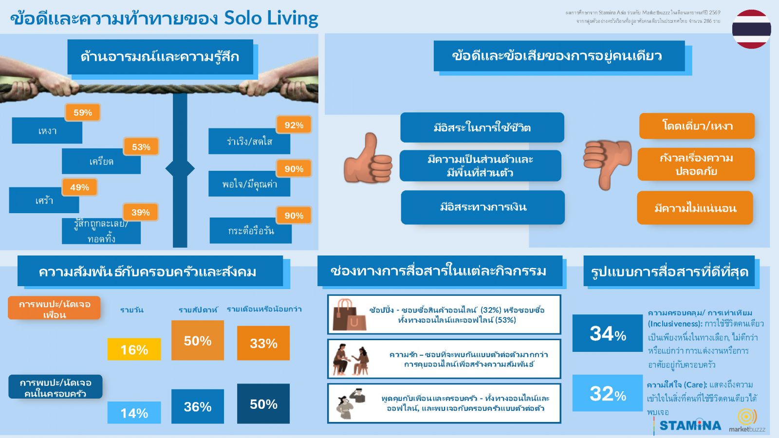 งานวิจัยฉบับสมบูรณ์นี้จัดทำโดย Stamina Asia ร่วมกับ Marketbuzzz เมื่อมกราคม 2026 ผ่านการสำรวจกลุ่มตัวอย่างคนไทยที่ใช้ชีวิตตัวคนเดียวเกือบ 300 คน (อายุ 25-55 ปี) ครอบคลุมทุกภูมิภาคและระดับฐานะทางสังคม โดยมี มร. เจอโรม เฮอร์วิโอ (Jerome Hervio) และ มร. แกรนท์ บาร์โทลี่ (Grant Bertoli) เป็นผู้นำเสนอข้อมูล ซึ่งชี้ชัดว่า "กลุ่มคนอยู่คนเดียว" ไม่ใช่กลุ่มก้อนเดียวกันทั้งหมด แต่แบ่งออกเป็น 4 เซกเมนต์ ที่มีความต้องการแตกต่างกัน และมีอำนาจการซื้อที่สูงมากอย่างที่แบรนด์คาดไม่ถึง
