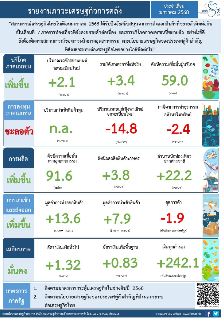 ภาวะศก.การคลังประจำเดือนม.ค.68สดใส ส่งออกพุ่ง-ท่องเที่ยวปัง-บริโภคเพิ่ม