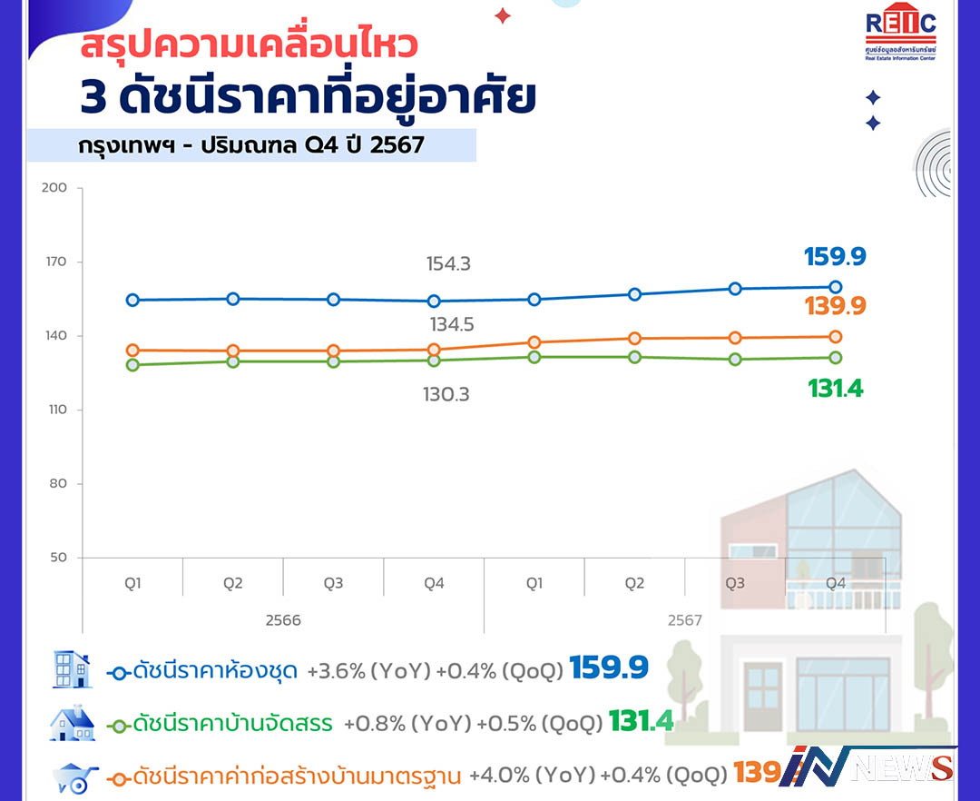 กรุงเทพฯ-REIC เผยราคาที่อยู่อาศัยไตรมาส 4 ปี 2567 ในพื้นที่เมืองและตามแนวรถไฟฟ้าเพิ่มสูงขึ้นต่อเนื่อง ปัจจัยจากต้นทุนราค...