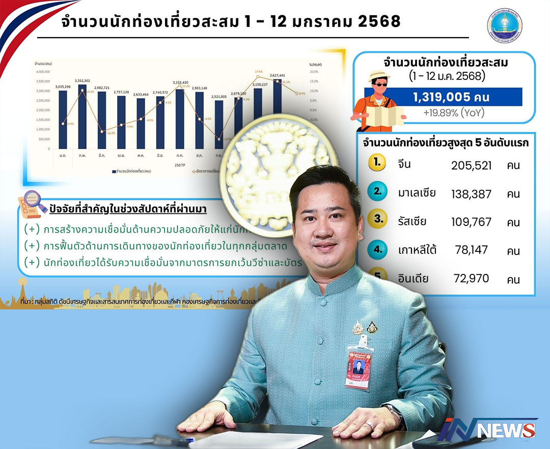 กรุงเทพฯ-รัฐบาล เผย 2 สัปดาห์แรกเดือนมกราคม 2568 ต่างชาติเที่ยวไทย 1.3 ล้านคน เพิ่มขึ้น 19.89% นทท.จีนครองแชมป์ เดินทางเ...