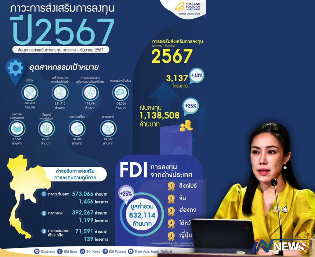 สรุปยอดส่งเสริมลงทุนปี67สูงสุดรอบ10ปี ทะลุ1.13ลลบ. 3.1โครงการบูมศก.ไทย