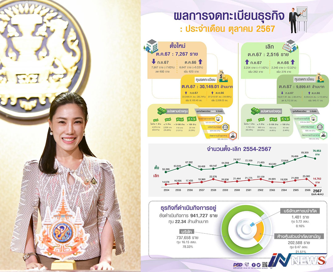 เผยต.ค.67ยอดจดทะเบียนตั้งบริษัทใหม่ กว่า7พันรายเงินทุนกว่า3หมื่นล้านบาท