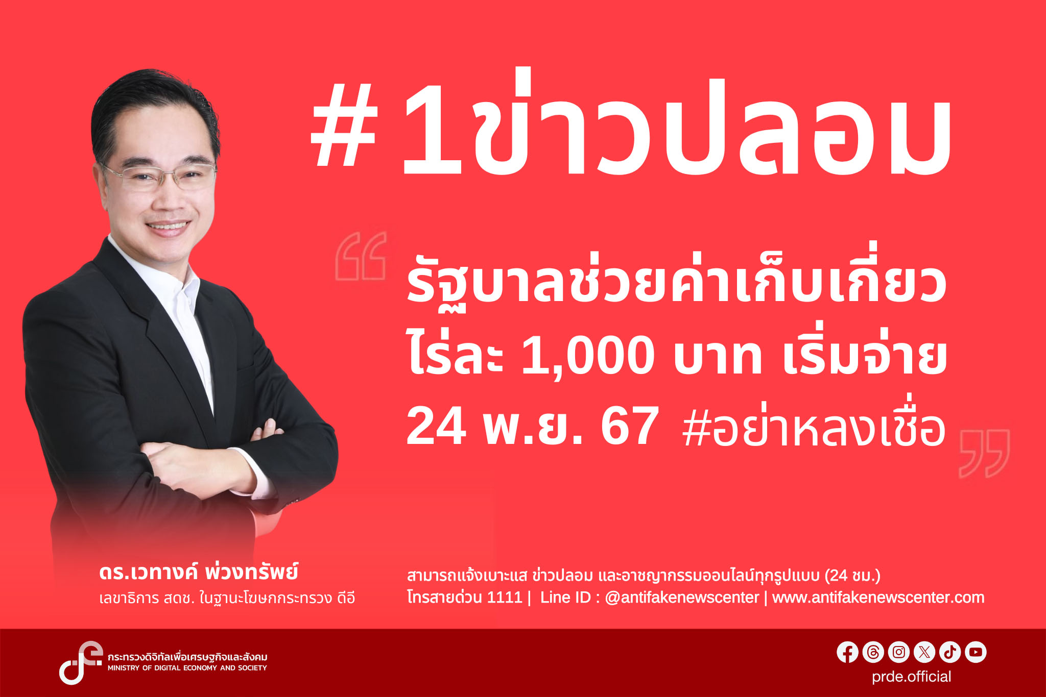 ดีอีเตือน'รัฐฯช่วยค่าเก็บเกี่ยวไร่ละ1พันบ. เริ่ม24 พ.ย.นี้ข่าวปลอมขออย่าเชื่อ-แชร์