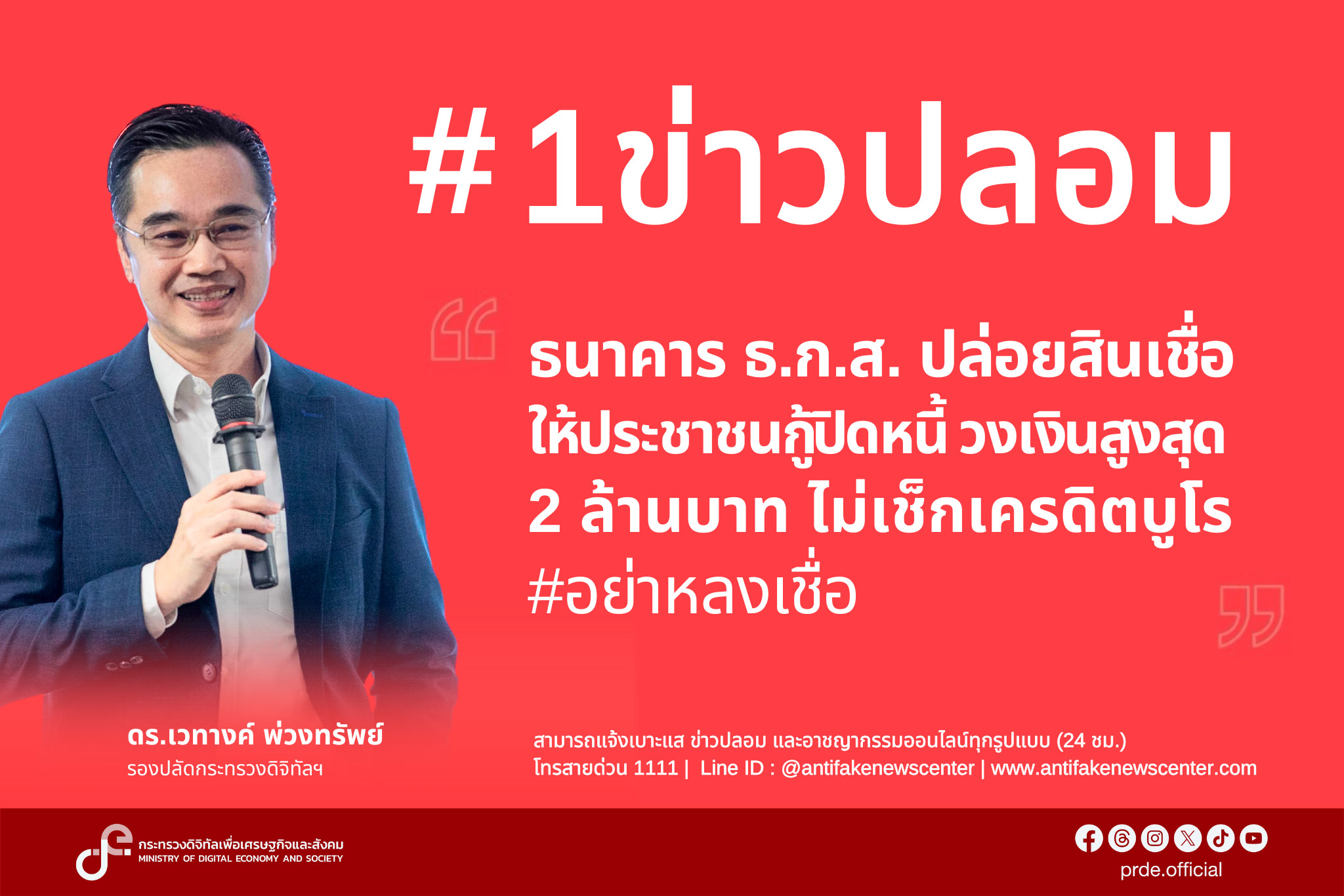กรุงเทพฯ-ดีอี เตือน “มิจฉาชีพ” โพสต์ข่าวปลอม “ธนาคาร ธ.ก.ส. ปล่อยสินเชื่อให้ประชาชนกู้ปิดหนี้ วงเงินสู...