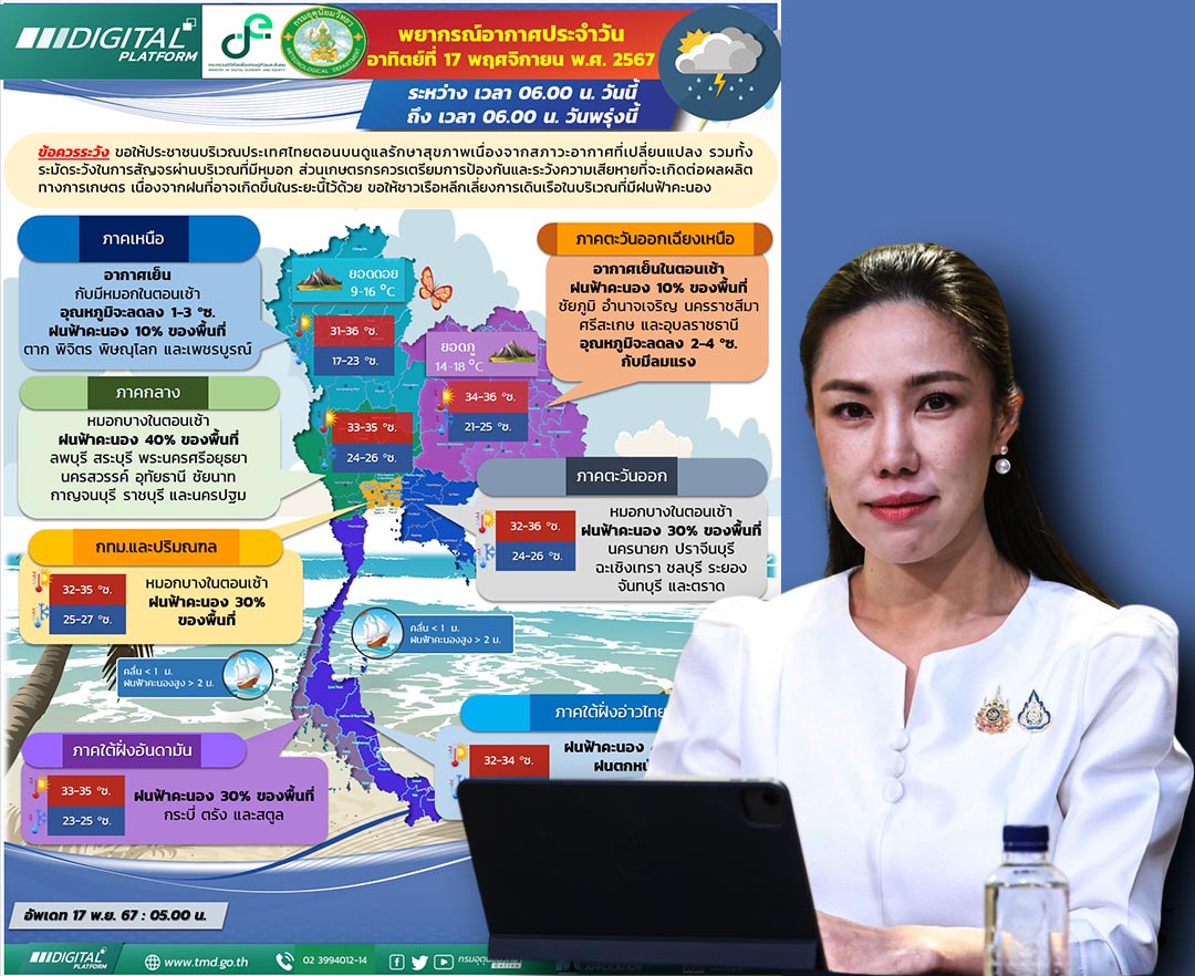 กรุงเทพฯ-ศปช. เตือนตอนบนอุณหภูมิลดลง พร้อมฝนฟ้าคะนองบางพื้นที่ เฝ้าระวังภาคใต้ฝนตกหนัก - ปริมาณน้ำมากอ่างเก็บน้ำภาคใต้ 7...