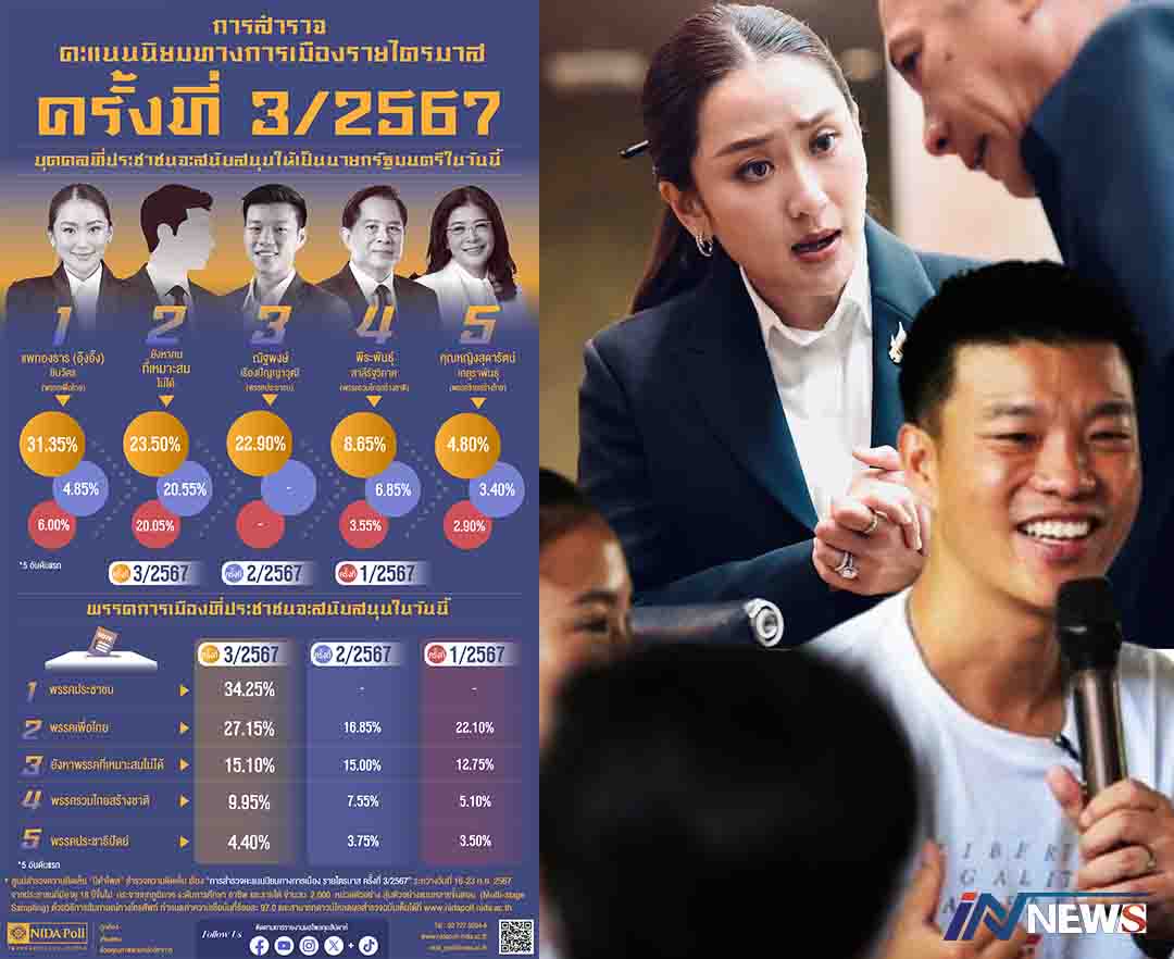'นิด้าโพล'สำรวจคะแนนนิยมคนการเมือง นายกฯอิงค์ทิ้งห่าง'เท้ง'/แต่ปชน.ยังแรง