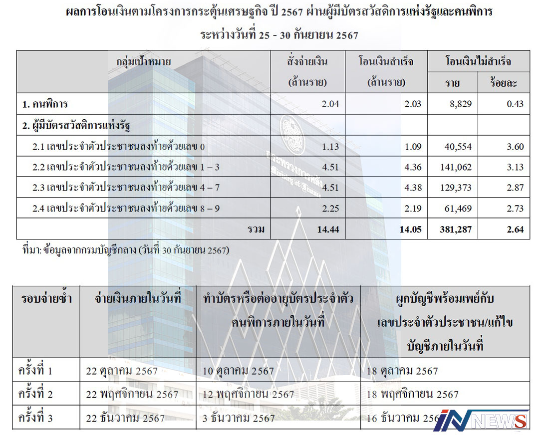 กรุงเทพฯ-การโอนเงินเมื่อวันที่ 30 ก.ย.2567 ให้ผู้มีบัตรสวัสดิการแห่งรัฐที่มีเลขประจำตัวประชาชนลงท้ายด้วยเลข 8 - 9 จำนวน ...