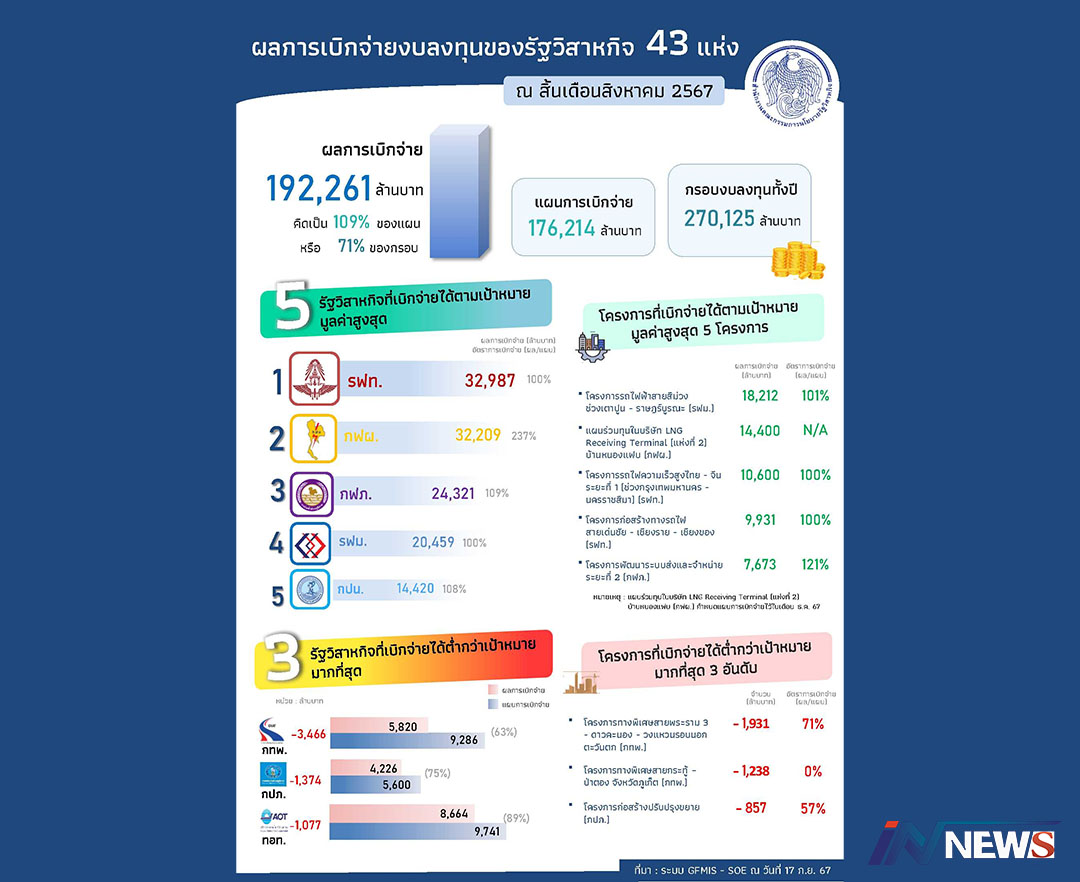 กรุงเทพฯ-การเบิกจ่ายงบลงทุนของรัฐวิสาหกิจที่อยู่ในกำกับของ สคร. จำนวน 43 แห่ง มีการเบิกจ่ายงบลงทุนจนถึงเดือนสิงหาคม 2567...