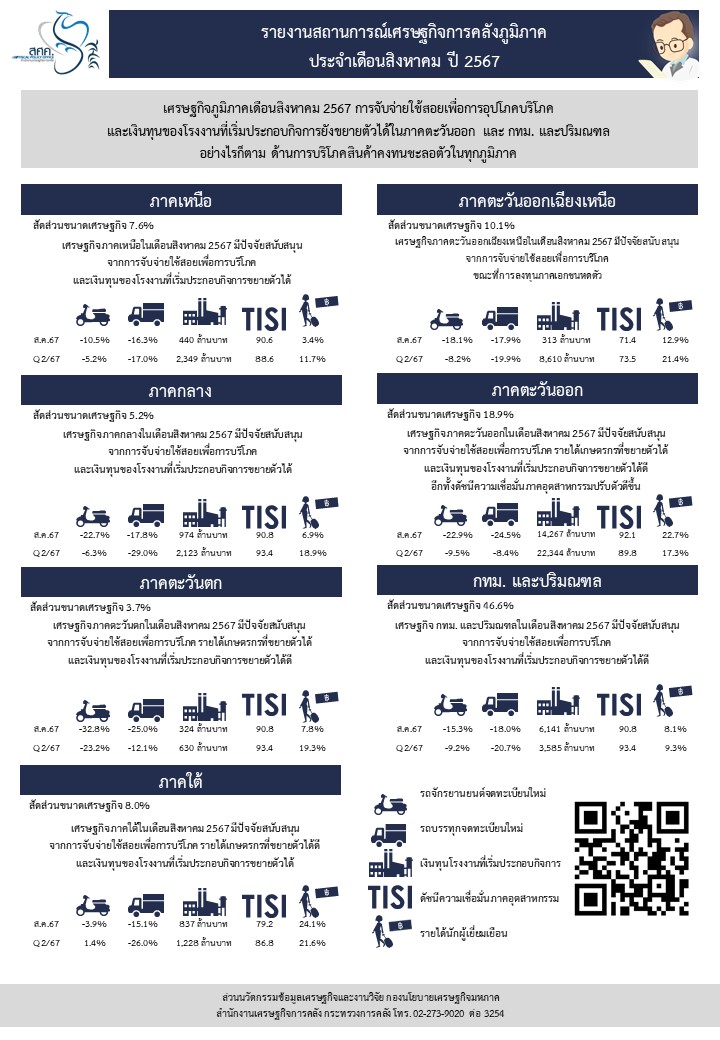 ภาวะเศรษฐกิจการคลังภูมิภาคส.ค.2567 ตอ.-กทม.ขยายตัว/สินค้าคงทนชะลอตัว