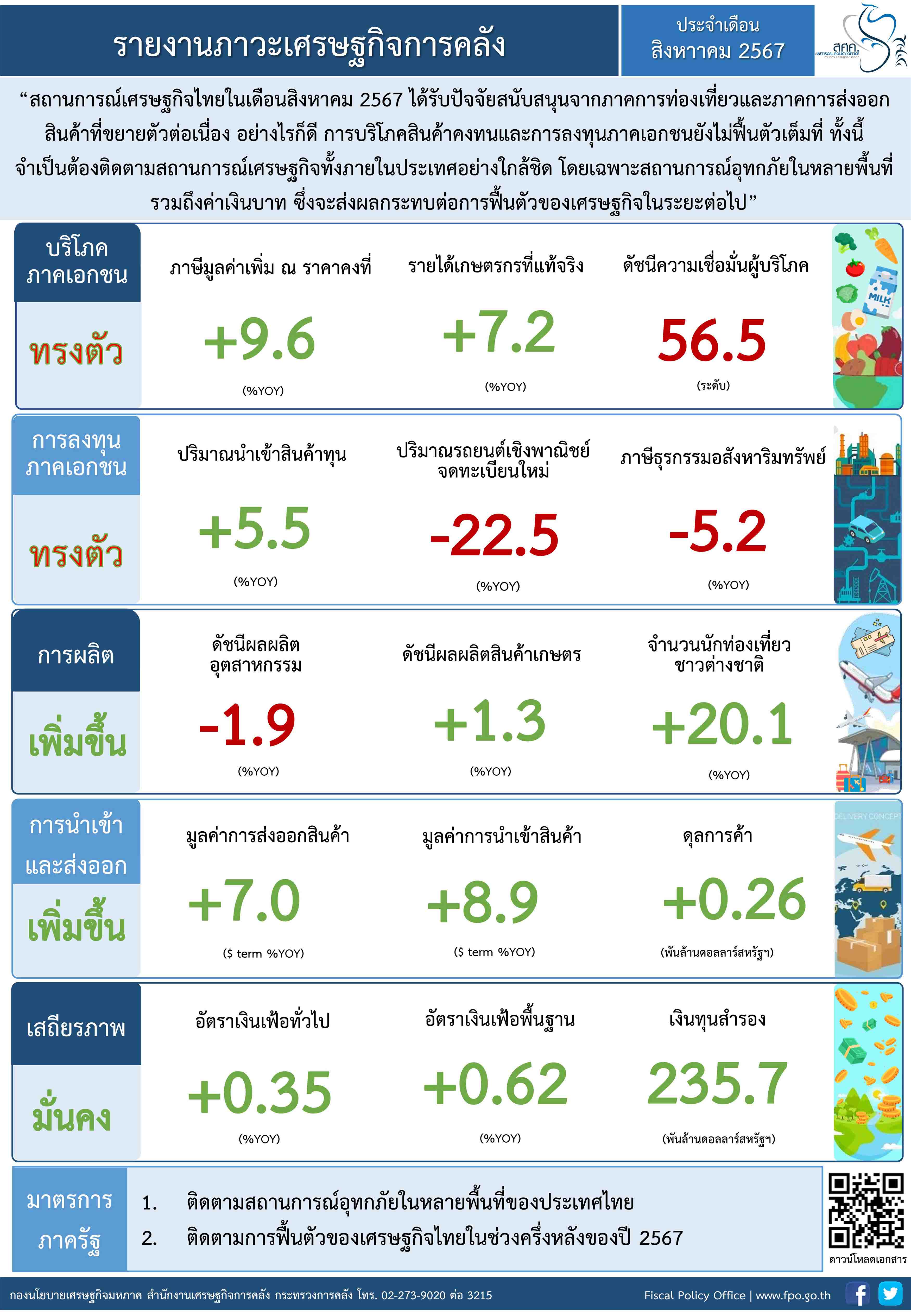 ภาวะเศรษฐกิจการคลังประจำส.ค.2567 ท่องเที่ยว-ส่งออกดันขยายตัว/ลงทุนฝืด