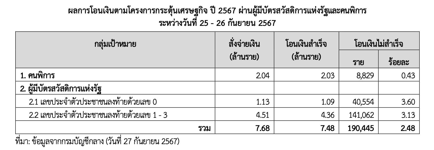 กรุงเทพฯ-ความคืบหน้าการโอนเงินตามโครงการกระตุ้นเศรษฐกิจ ปี 2567 ผ่านผู้มีบัตรสวัสดิการแห่งรัฐและคนพิการ ซึ่งกระทรวงการคล...