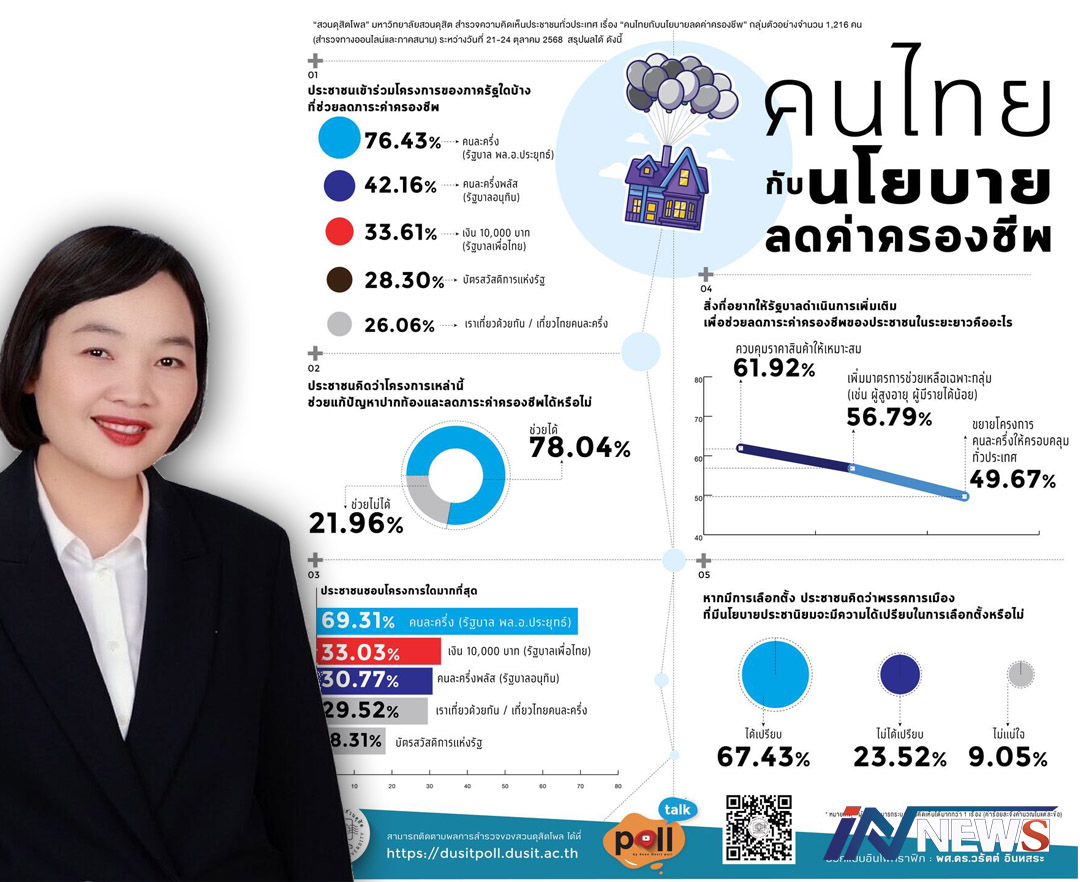 กรุงเทพฯ- สวนดุสิตโพล มหาวิทยาลัยสวนดุสิต สำรวจความคิดเห็นประชาชน เรื่อง คนไทยกับนโยบายลดค่าครองชีพ พบส่วนใหญ่เห็นว่าช่ว...