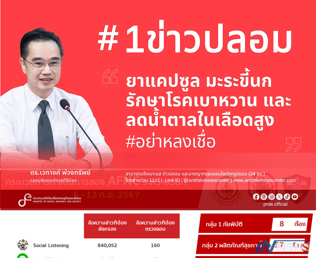กรุงเทพฯ-กระทรวงดิจิทัลเพื่อเศรษฐกิจและสังคม (ดีอี) ตรวจพบข่าวปลอมรายสัปดาห์ ที่ประชาชนให้ความสนใจสูงสุดอันดับที่ 1 เรื่...