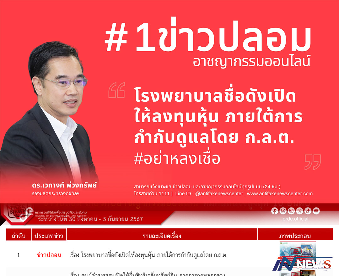 ดีอีเตือนข่าวปลอม'รพ.ดังเปิดให้ลงทุนหุ้น กำกับดูแลโดยก.ล.ต.'อย่าเชื่อและไม่แชร์'