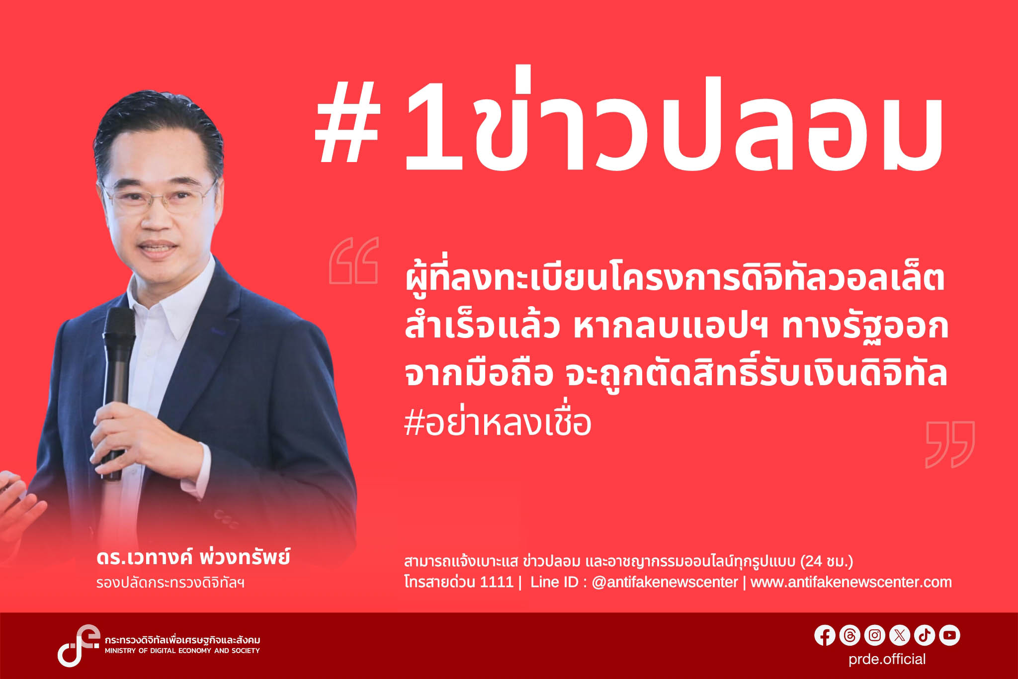 กรุงเทพฯ-ดีอี เตือน ข่าวปลอม “ผู้ที่ลงทะเบียนโครงการดิจิทัลวอลเล็ตสำเร็จแล้ว หากลบแอปฯ ทางรัฐ จะถูกตัดสิทธิ์รับเงิ...