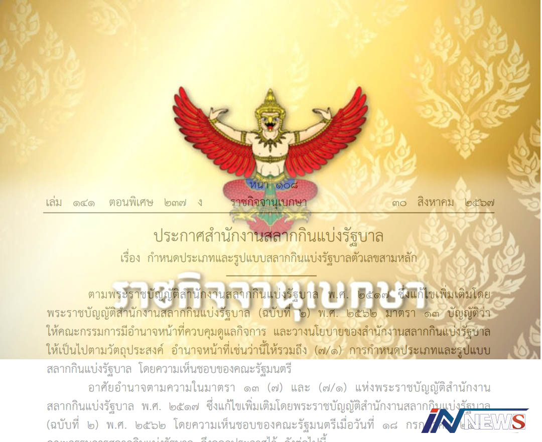 กรุงเทพฯ-ราชกิจจานุเบกษา เผยแพร่ประกาศสำนักงานสลากกินแบ่งรัฐบาล กำหนดประเภทและรูปแบบสลากกินแบ่งรัฐบาลตัวเลขสามหลัก (หวย ...