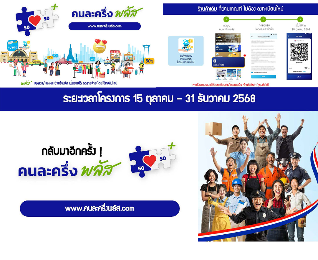 กรุงเทพฯ-โครงการคนละครึ่ง พลัส (โครงการฯ) ได้เปิดให้ร้านค้าลงทะเบียนเข้าร่วมโครงการฯ เมื่อวันที่ 15 ตุลาคม 2568 เป็นวันแ...