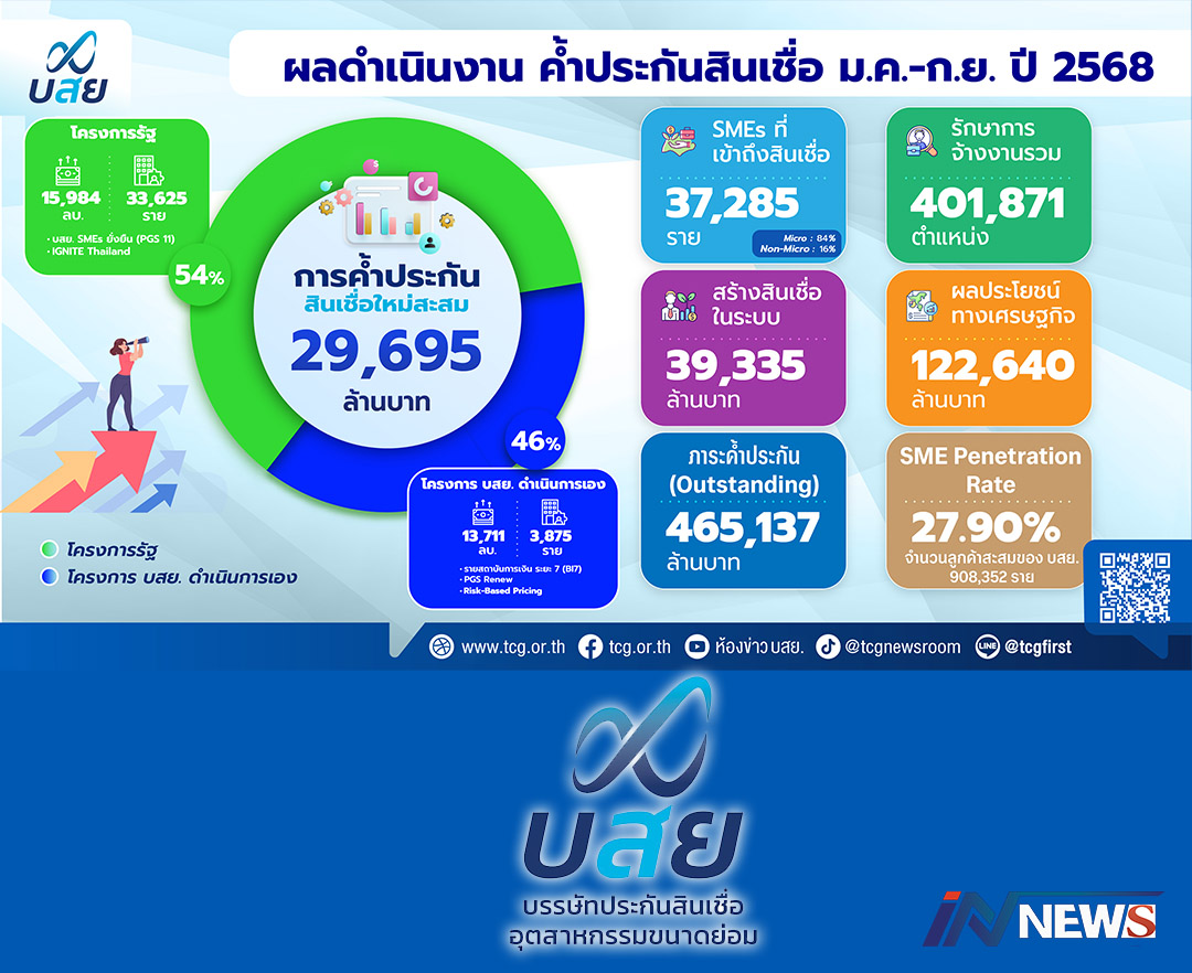 กรุงเทพฯ-ผลดำเนินงาน บสย. ช่วง 9 เดือน ปี 2568 (ม.ค. – ก.ย.) มียอดค้ำประกันสินเชื่อรวม 29,695 ล้านบาท ผ่าน 2 โครงก...