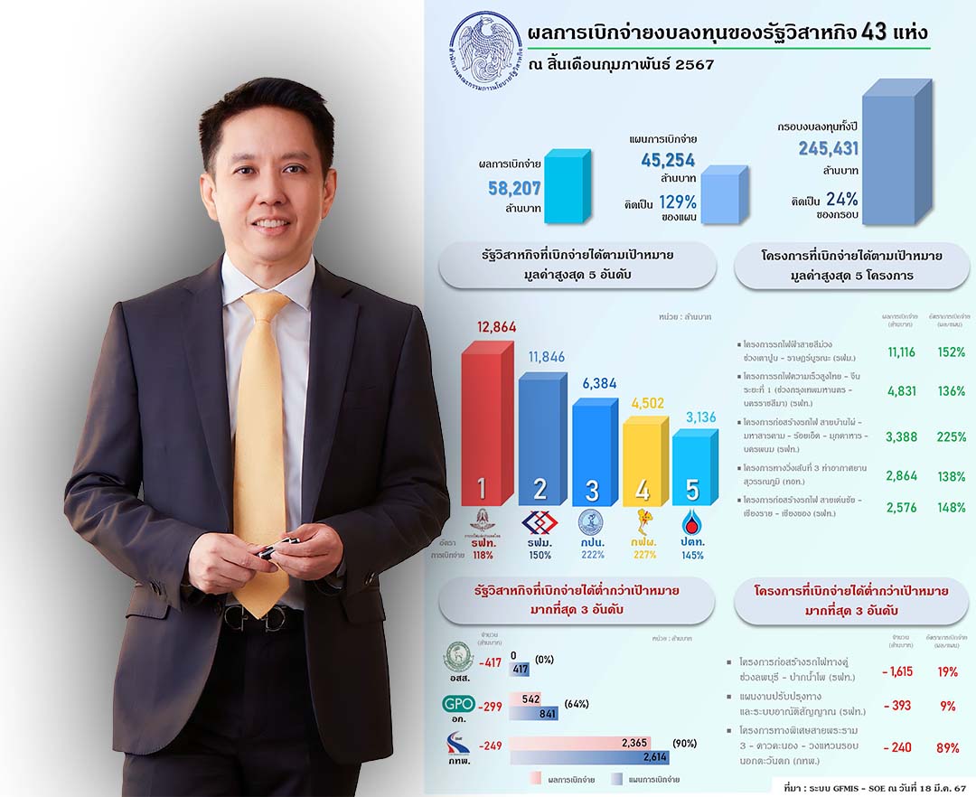 กรุงเทพฯ-รัฐวิสาหกิจมีการเบิกจ่ายงบลงทุนจนถึงเดือนกุมภาพันธ์ 2567 จำนวน 58,207 ล้านบาท หรือคิดเป็นร้อยละ 129 ของแผนการเบ...