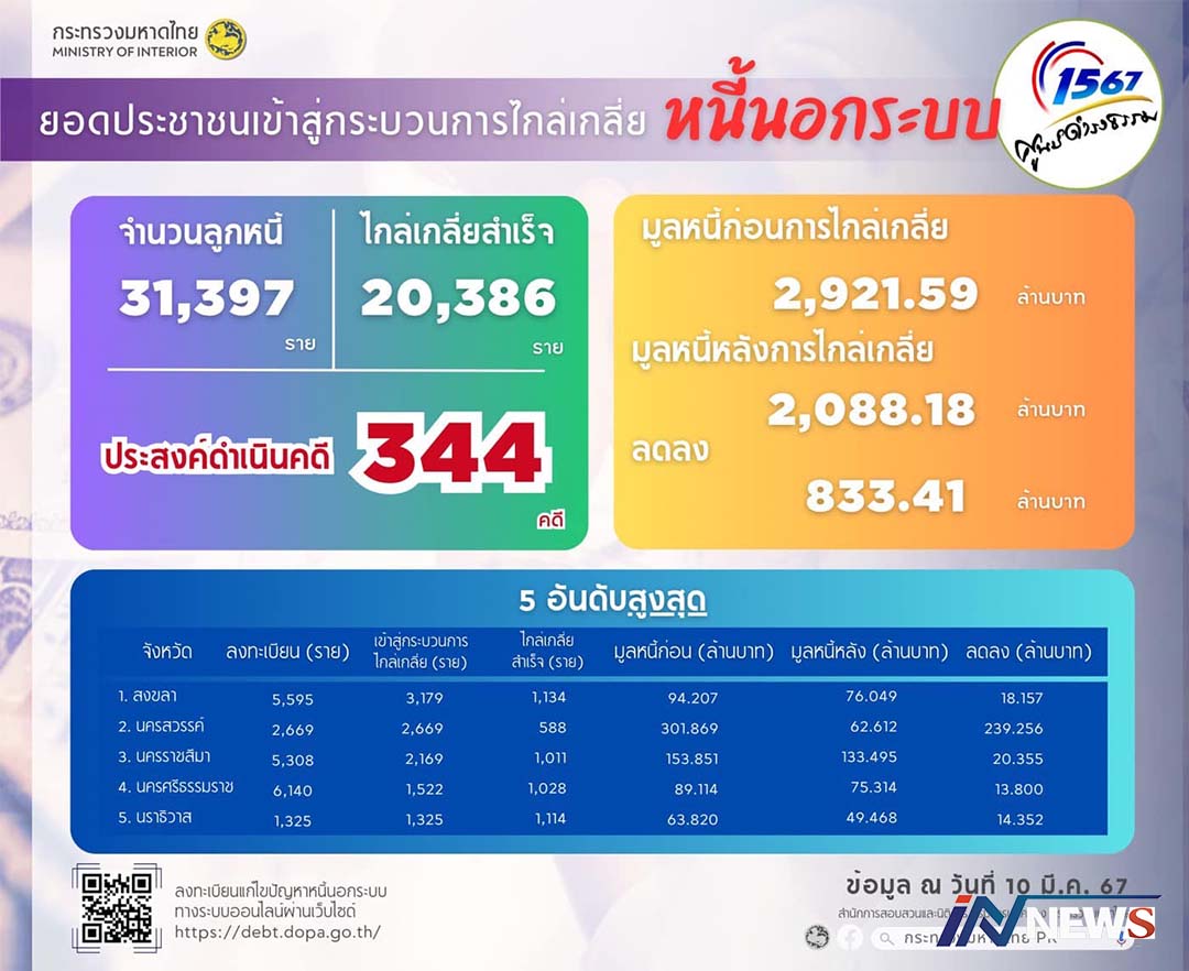 แก้หนี้นอกระบบขอไกล่เกลี่ย3.1หมื่นคน ทำสำเร็จ2หมื่นคนมูลหนี้กว่า833ล้านบาท