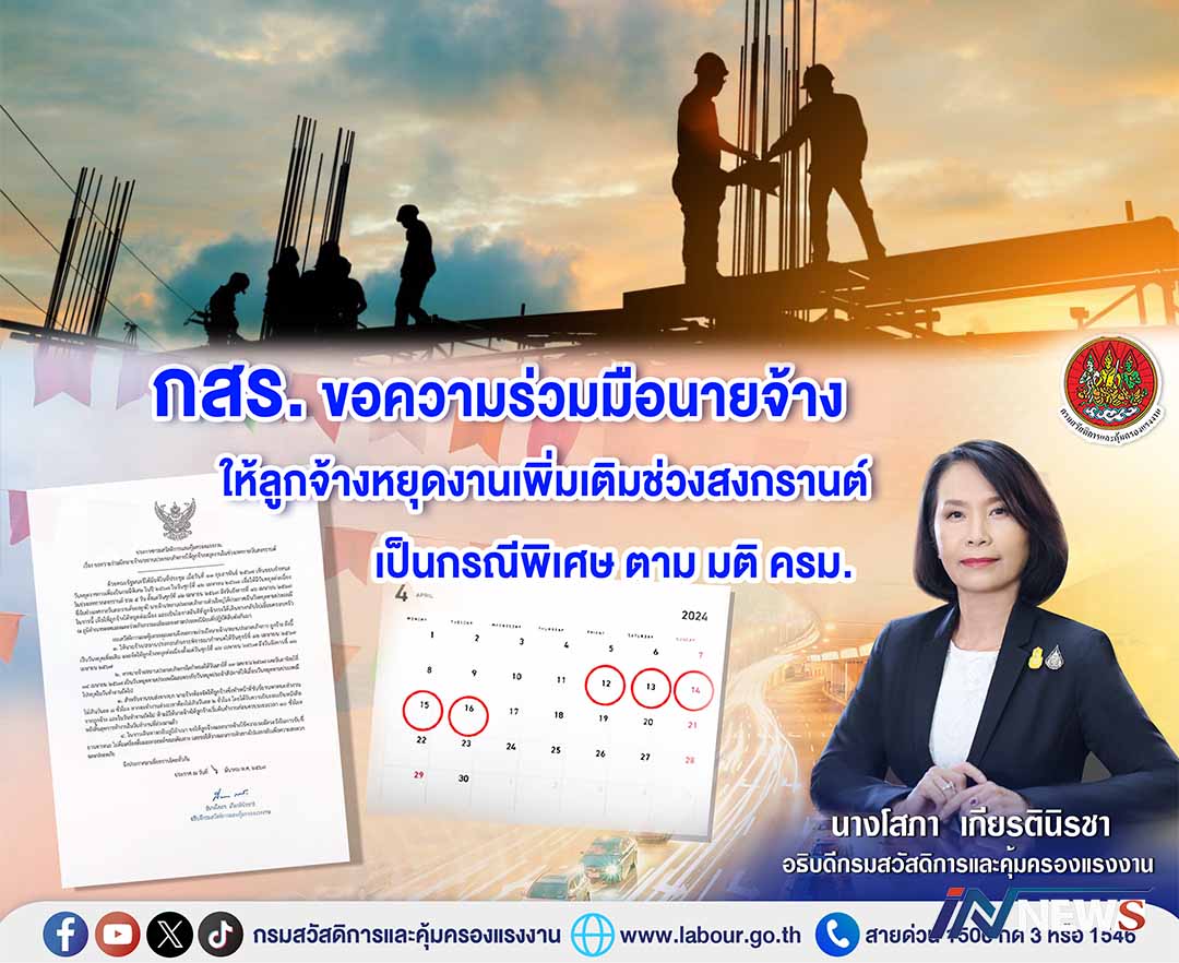 กสร.ขอ'นายจ้าง'ให้ลูกจ้างหยุดงาน5วัน ช่วงสงกรานต์กรณีพิเศษตามมติครม.