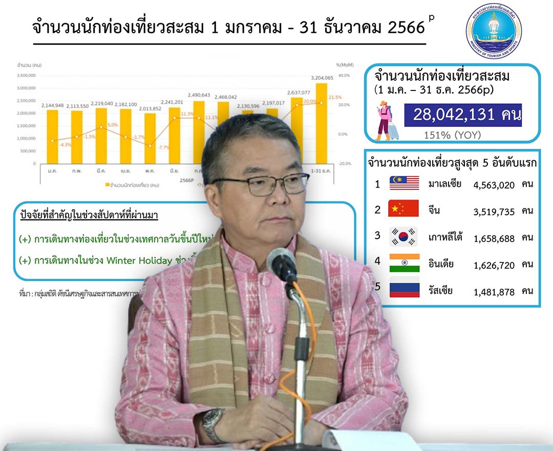สรุปตัวเลขนักท่องเที่ยวเยือนไทยปี2566 สูงกว่า28ล้านคนช่วงวันปีใหม่5.4หมื่นคน