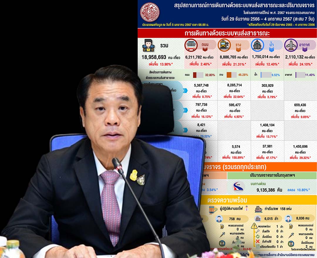 กรุงเทพฯ-กระทรวงคมนาคม สรุปรายงานข้อมูลการเดินทางและอุบัติเหตุช่วงเทศกาลปีใหม่ 2567 ระหว่างวันที่ 29 ธันวาคม 2566 - 4 มก...