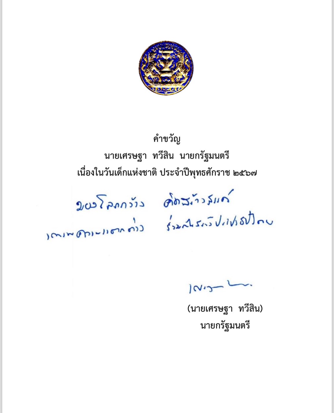 นายกฯมอบคำขวัญวันเด็กประจำปี2567 เชื่อเด็กไทย'เก่งมีศักยภาพ-คิดดี-ทันสมัย'