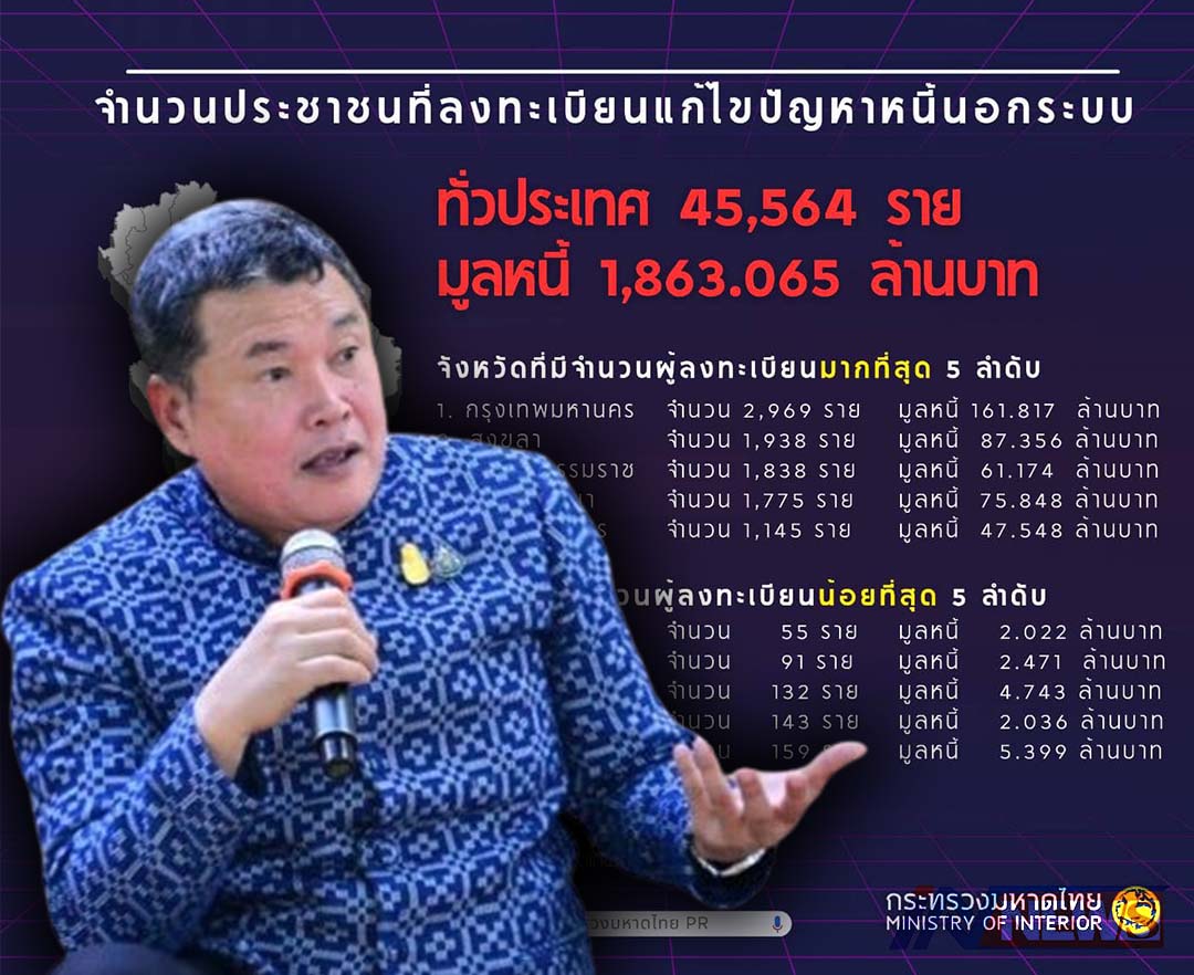 กรุงเทพฯ-มท. เปิดรับลงทะเบียนหนี้นอกระบบวันที่ 3 รวมมูลหนี้กว่า 1,863 ล้านบาท ประชาชนลงทะเบียนแล้ว 45,564 ราย กทม. ยังคร...