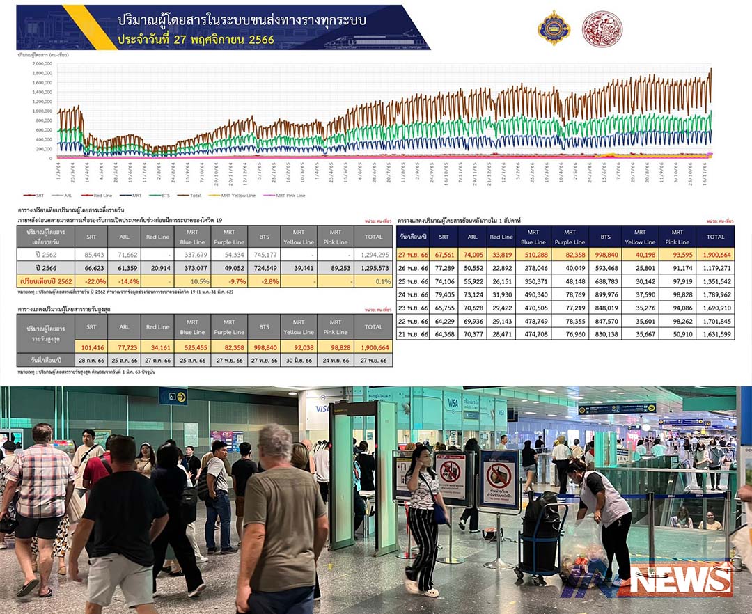 กรุงเทพฯ-กรมการขนส่งทางรางเผยวันลอยกระทงเมื่อวาน มีผู้ใช้บริการระบบราง รวม 1,900,664 คน-เที่ยว โดยในจำนวนนั้นมีผู้ใช้บริ...
