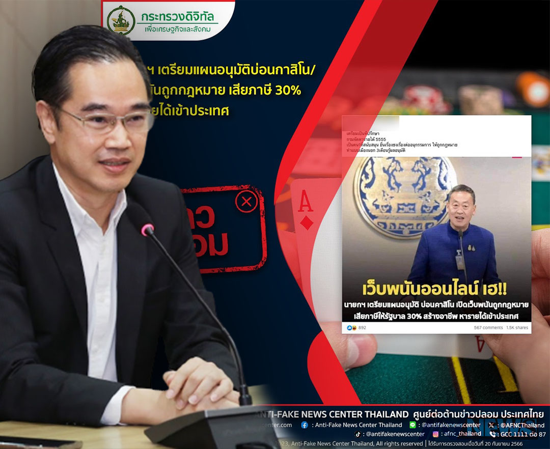 ดีอีเตือนข่าวนายกฯเล็งอนุมัติบ่อนกาสิโน ถูกกม.เป็นข่าวปลอมหยุดแชร์ต่อ