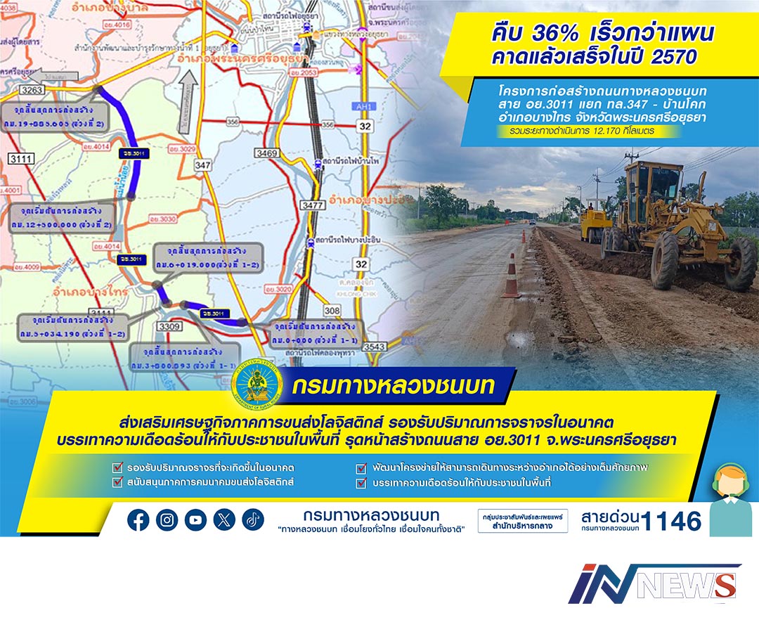 ทช.อัปเดตสร้างถนนสายอย.3011อยุธยา คืบหน้ากว่า36%คาดแล้วเสร็จในปี2570
