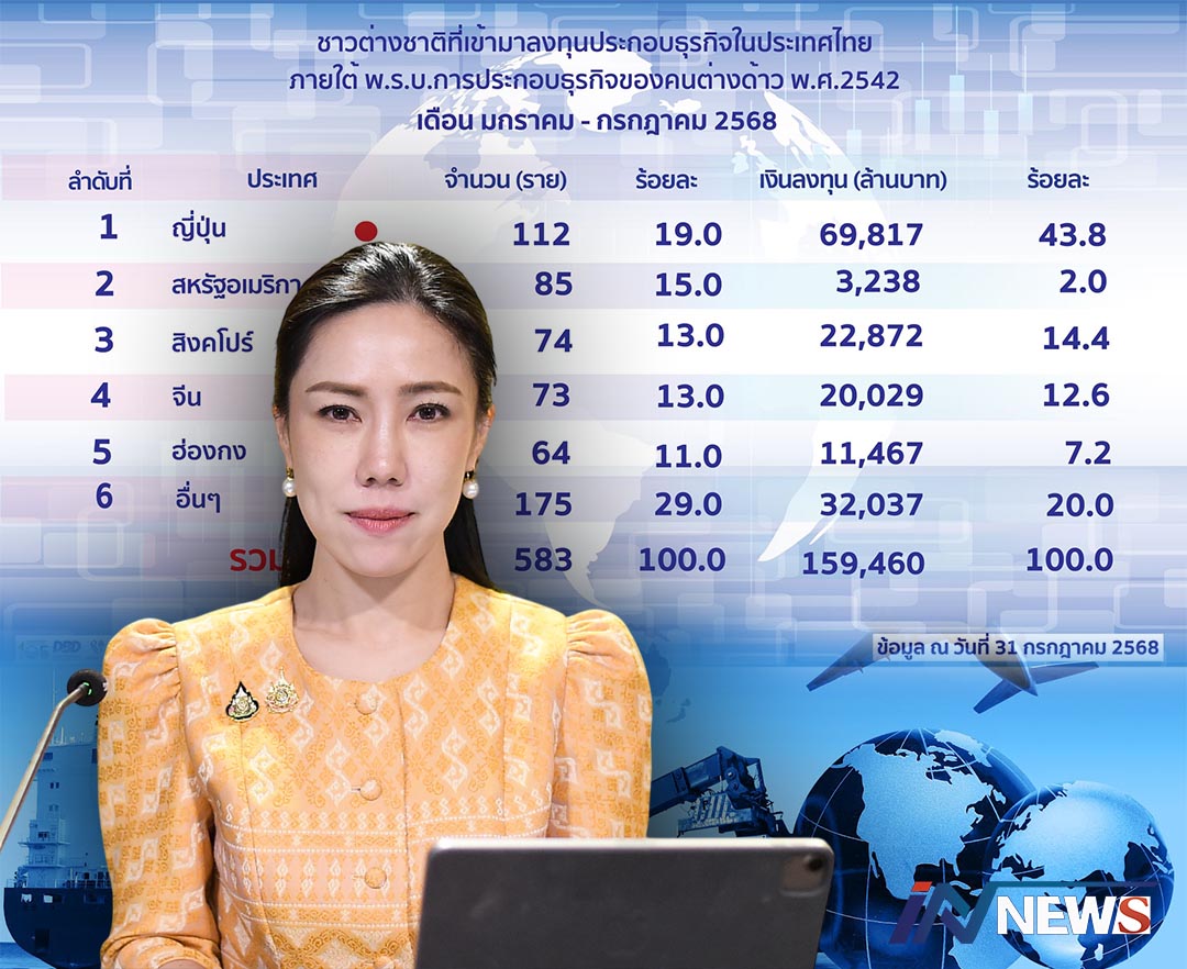 ยุครัฐบาลอุ๊งอิ๊งต่างชาติแห่ลงทุนเท่าตัว 6เดือนปี68มูลค่ากว่า1.5แสนล.ญี่ปุ่นนำ