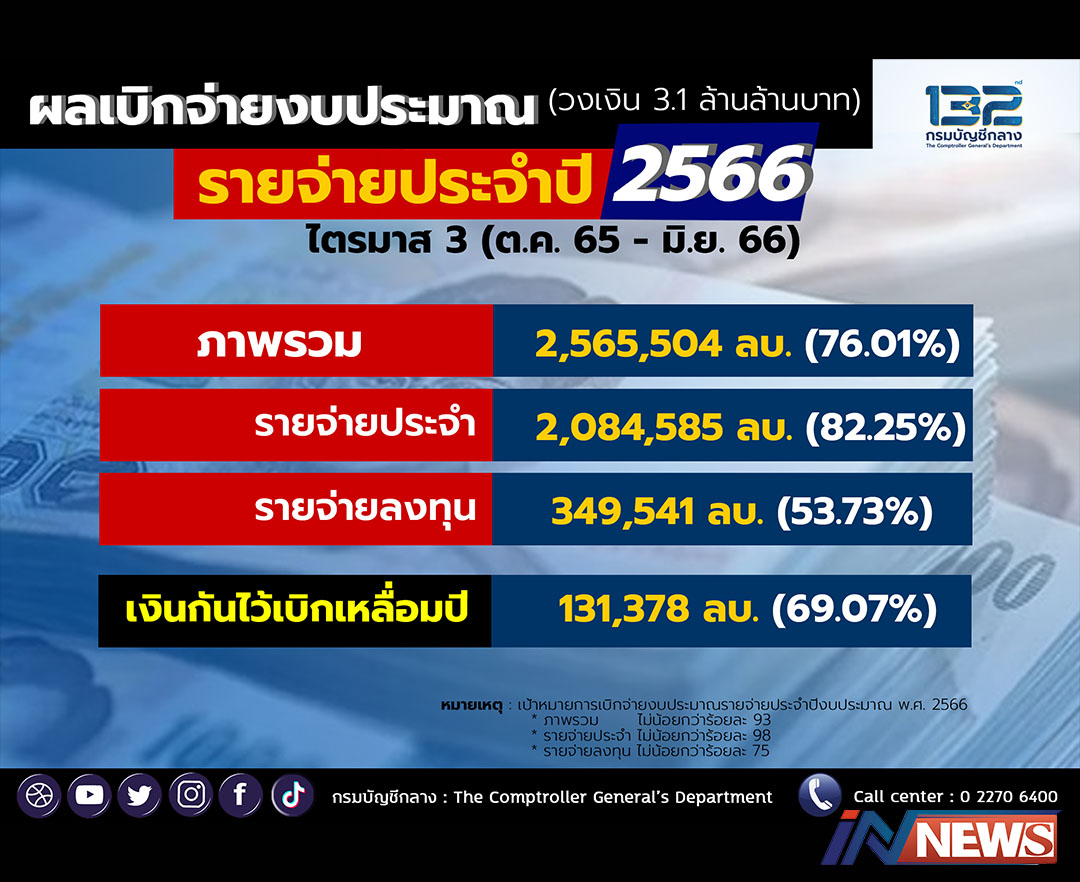 กรุงเทพฯ-กรมบัญชีกลางเผยผลเบิกจ่ายเงินงบประมาณฯ สิ้นไตรมาส 3 ปีงบประมาณ 66ผลเบิกจ่ายเงินงบประมาณรายจ่ายประจำปีงบประมาณ พ...