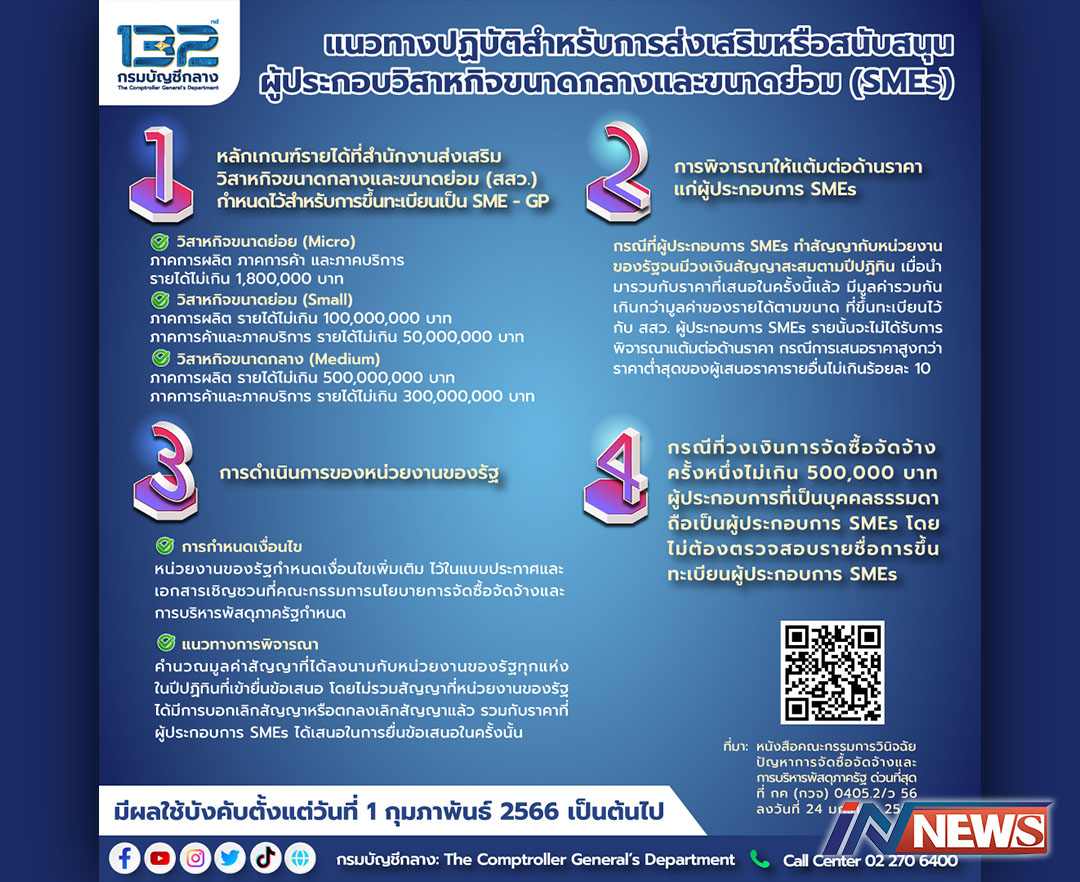 กรุงเทพฯ-กรมบัญชีกลางกำหนดแนวทางปฏิบัติ สำหรับการส่งเสริมหรือสนับสนุนผู้ประกอบการวิสาหกิจขนาดกลางและขนาดย่อม (SMEs) เพิ่...