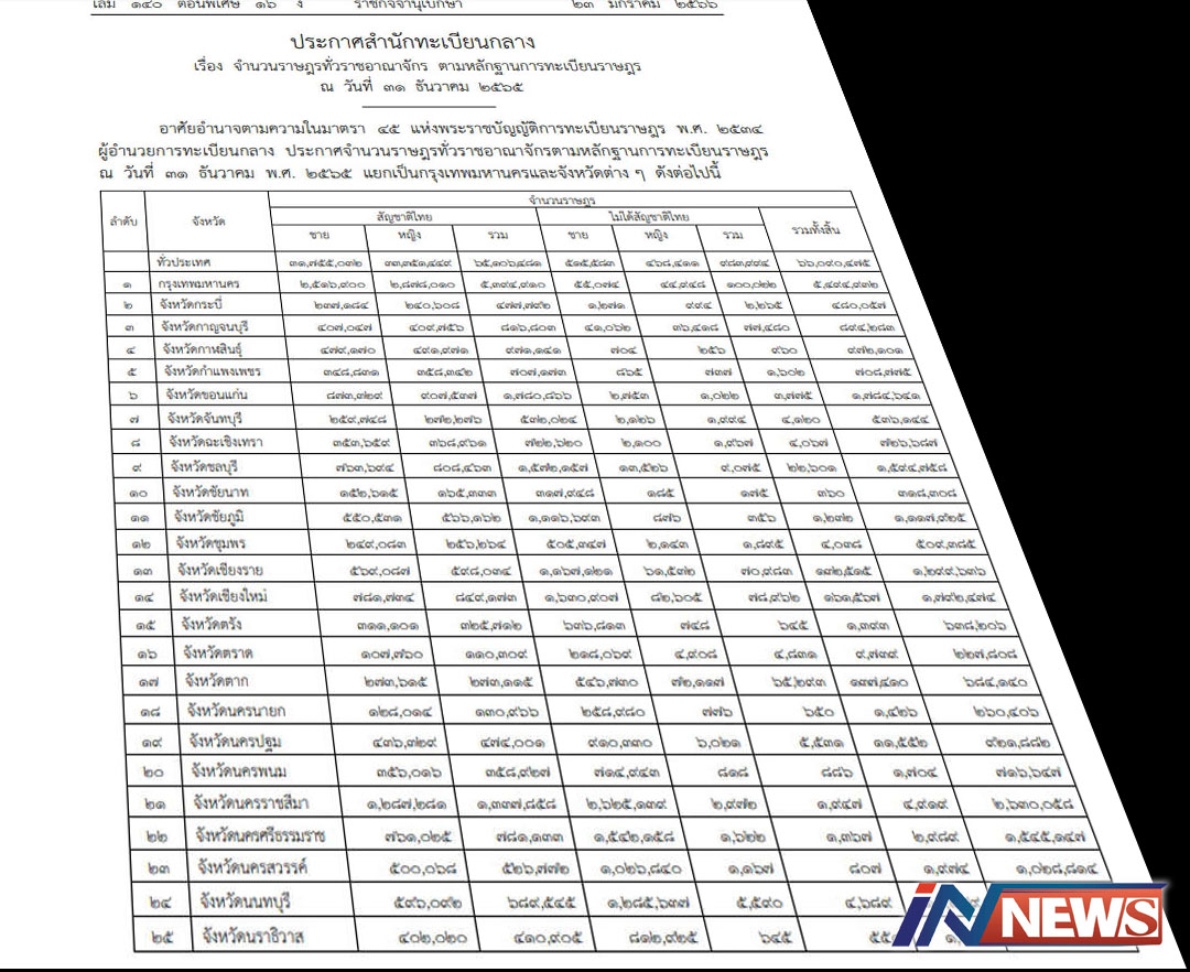 กรุงเทพฯ-สำนักทะเบียนกลาง กระทรวงมหาดไทย ออกประกาศ รายงานจำนวนราษฎรทั่วราชอาณาจักร ตามหลักฐานการทะเบียนราษฎร ณ สิ้นปี 25...