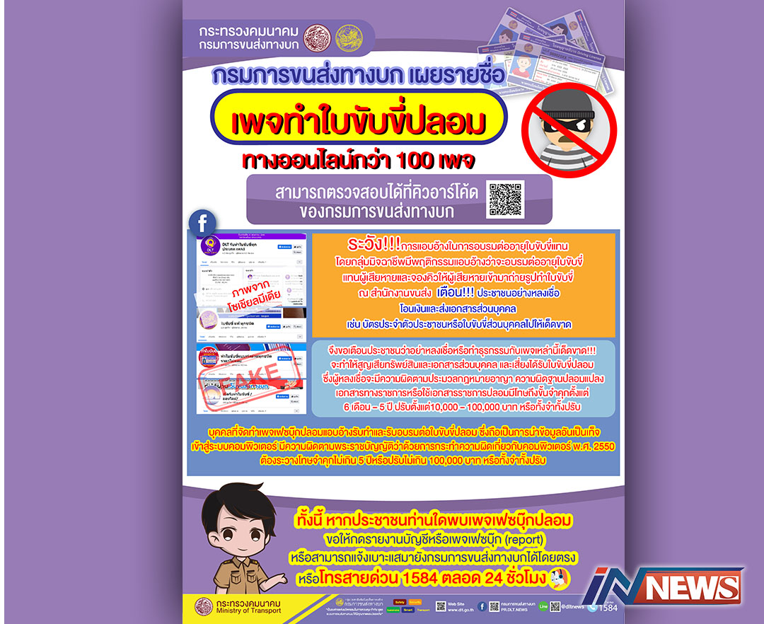 ขบ.เปิด100รายชื่อเพจทำใบขับขี่ปลอม เตือนปชช.อย่าหลงเชื่อ/โอนเงินเด็ดขาด