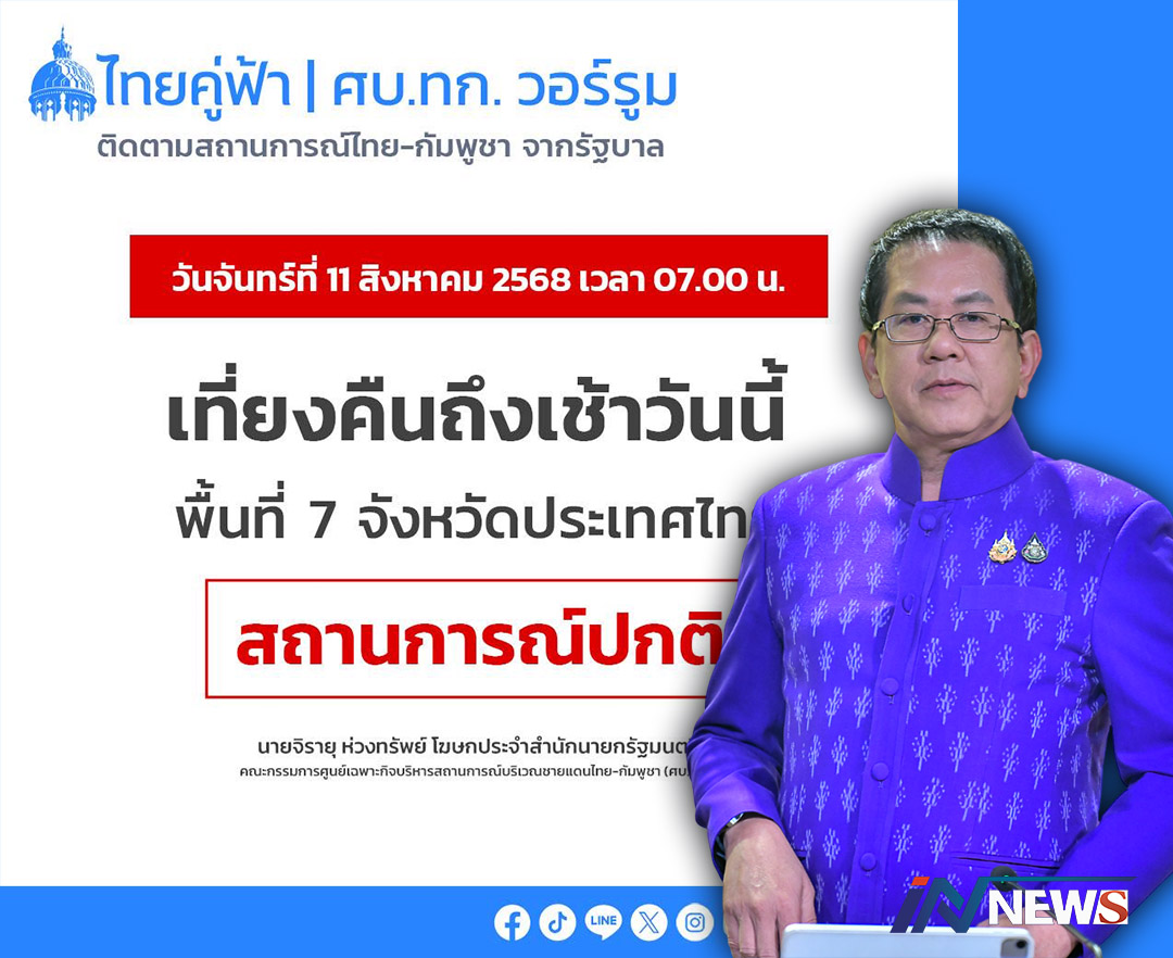 กรุงเทพฯ-“ไทยคู่ฟ้า” รายงานชายแดนไทย – กัมพูชา 7 จังหวัด ตั้งแต่เวลา 18.00 - 07.00 น. วันนี้ (วันพุธที...