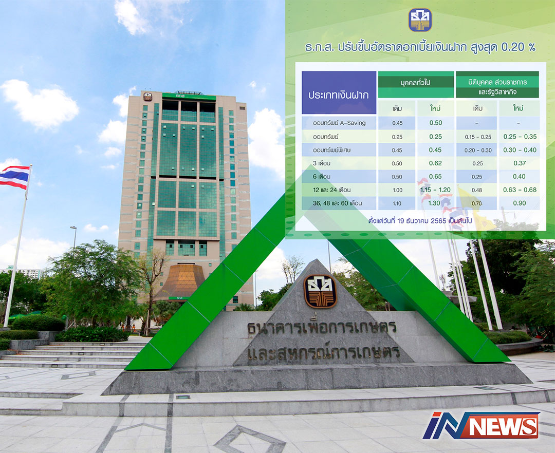 ธ.ก.ส.ปรับขึ้นดอกเบี้ยเงินฝากแต่ยังตรึง ดอกเบี้ยเงินกู้หนุนเกษตรกรช่วงฟื้นตัว