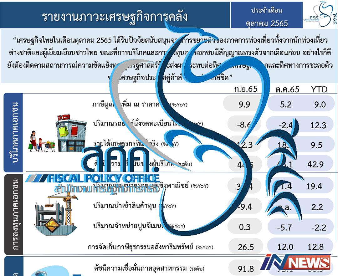 ก.คลังเผยภาวะเศรษฐกิจการคลังต.ค.65 ท่องเที่ยวกระตุ้นขยายตัว/ลงทุนทรงตัว