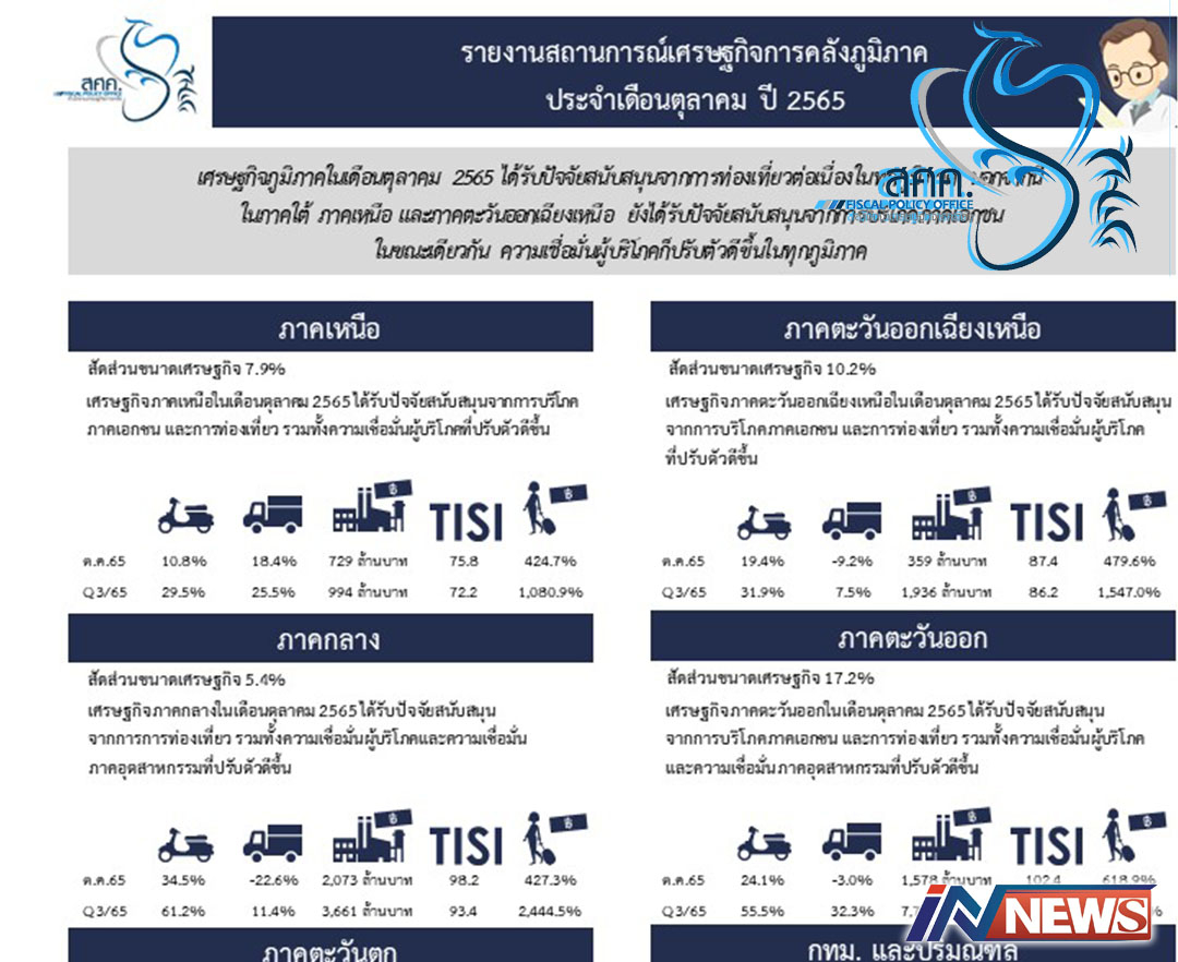 ภาวะเศรษฐกิจการคลังภูมิภาคในต.ค.65 ท่องเที่ยวกระตุ้นทุกภาคมีการบริโภคเพิ่ม