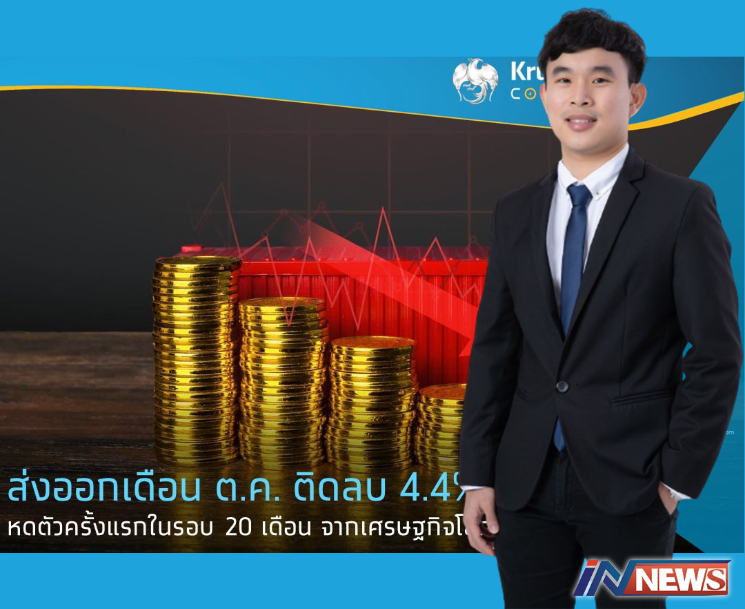 กรุงเทพฯ-ส่งออกเดือน ต.ค. ติดลบ 4.4%YoY หดตัวครั้งแรกในรอบ 20 เดือน ต่ำกว่าการคาดการณ์ของตลาดที่คาดว่าขยายตัว 6% จากอุปส...