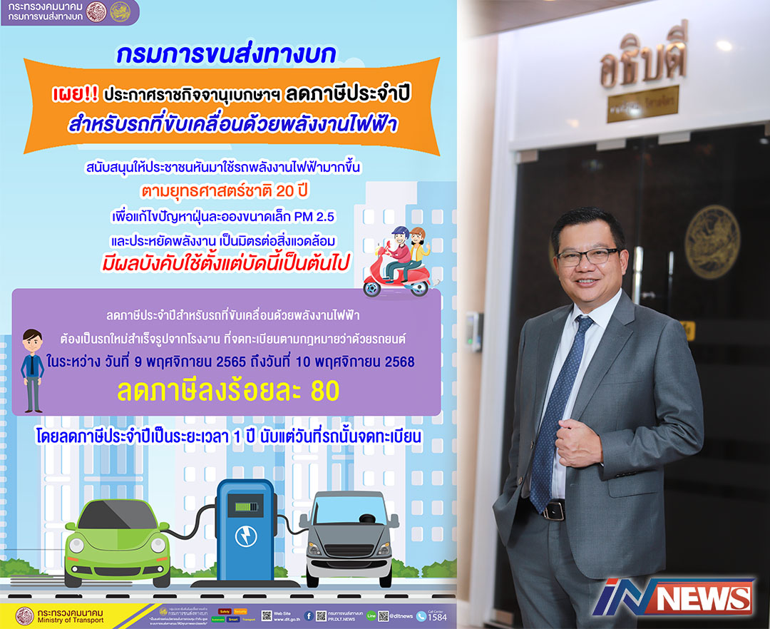 กรุงเทพฯ-กรมการขนส่งทางบก เผยประกาศราชกิจจานุเบกษาลดภาษีประจำปีสำหรับรถที่ขับเคลื่อนด้วยพลังงานไฟฟ้า สนับสนุนให้ประชาชนห...