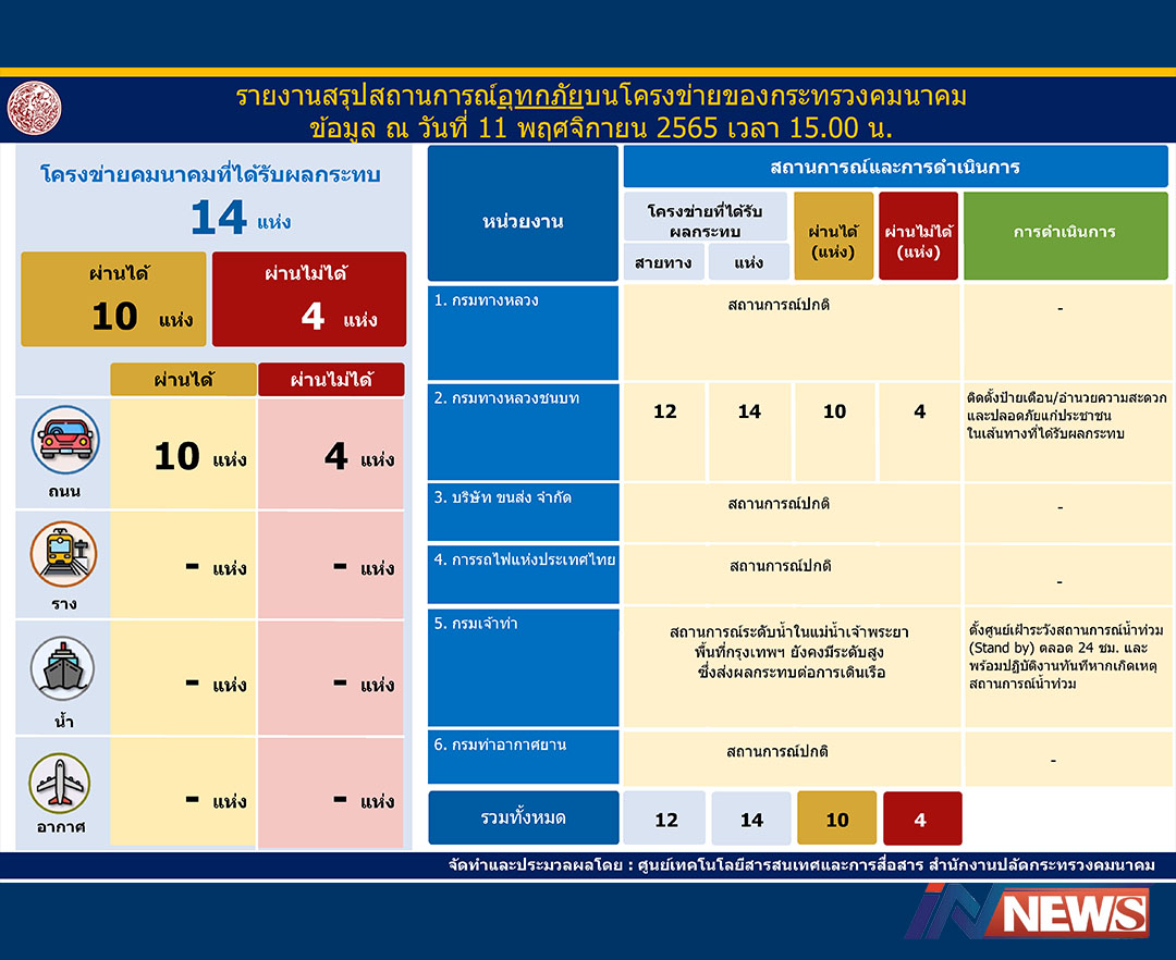 กรุงเทพฯ-กระทรวงคมนาคม สรุปรายงานอุทกภัยในเส้นทางคมนาคมทั่วประเทศ ข้อมูล ณ วันที่ 11 พฤศจิกายน 2565 ถนนทางหลวง...