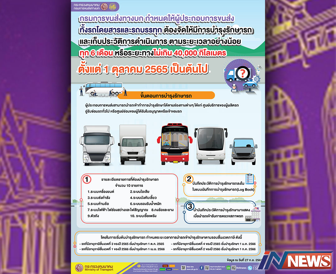 กรมขบ.กำหนดให้รถโดยสาร-รถบรรทุก ให้บำรุงรักษารถเก็บประวัติทุก6เดือน