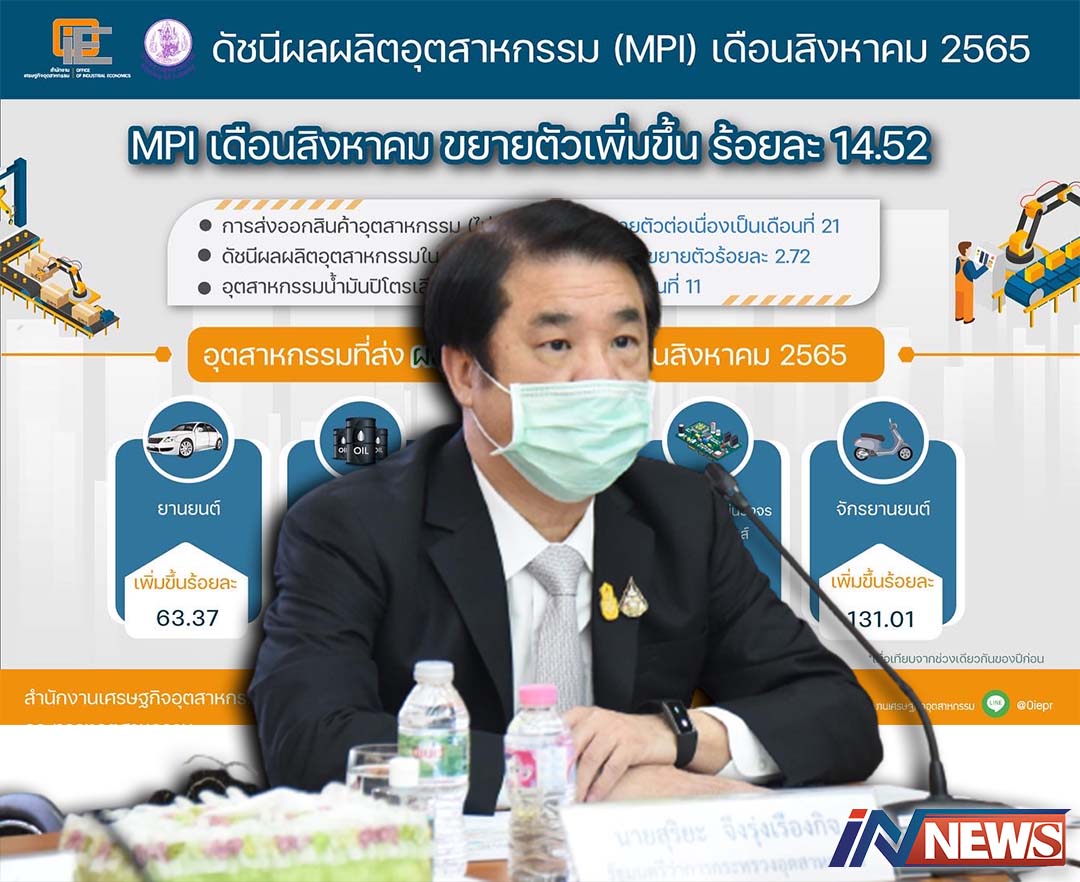 กรุงเทพฯ-อก.เผยดัชนีผลผลิตอุตสาหกรรม (MPI) เดือนสิงหาคม ปี 2565 ขยายตัวร้อยละ 14.52 เมื่อเทียบกับช่วงเดียวกันของปีก่อน โ...