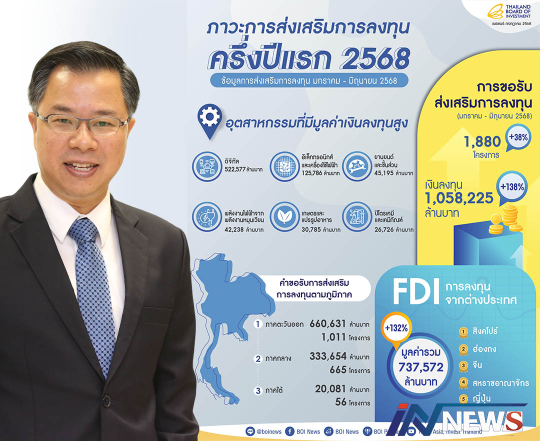 กรุงเทพฯ-บีโอไอ เผยยอดขอรับการส่งเสริมการลงทุนครึ่งแรก ปี 2568 เติบโตต่อเนื่องท่ามกลางความไม่แน่นอนของสถานการณ...