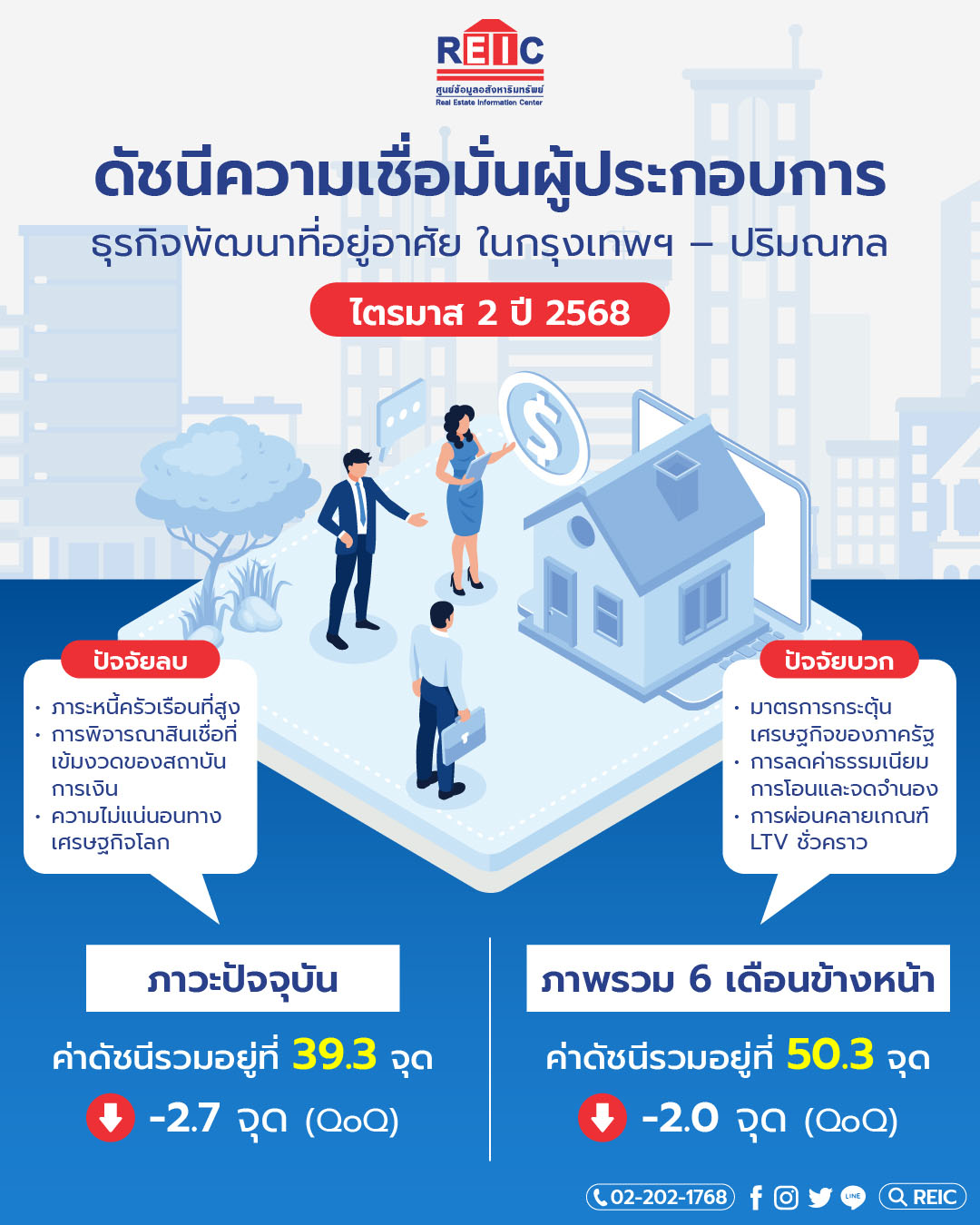 ดัชนีความเชื่อมั่นของผปก.ธุรกิจอสังหาฯ กรุงเทพฯ-ปริมณฑลQ2ปี68ลด2.7จุด